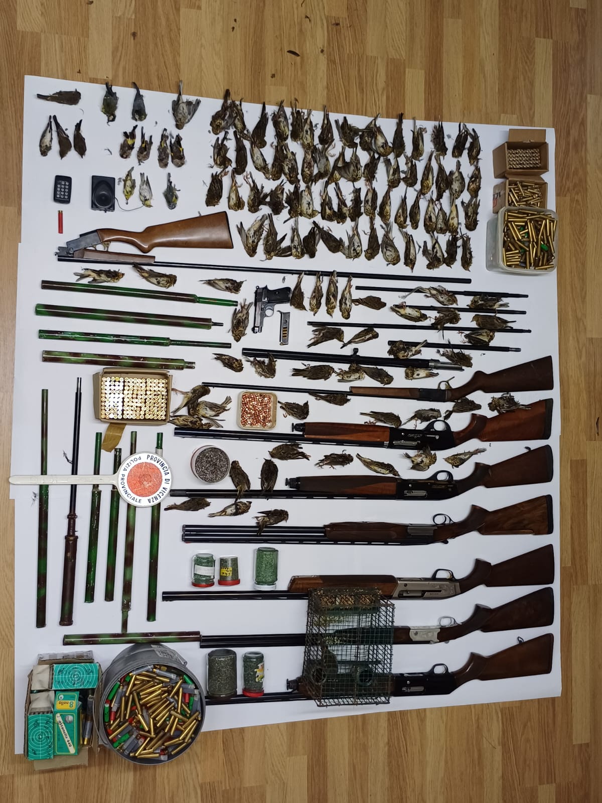 Colto in flagrante il bracconiere, gli agenti lo hanno raggiunto e hanno da subito rinvenuto il telecomando per il comando a distanza del richiamo acustico elettromagnetico. La perquisizione dell’abitazione ha portato al sequestro di 8 fucili, 11 silenziatori artigianali, migliaia di munizioni di vario calibro, inneschi e polvere da sparo, gabbie a scatto e gabbie con richiami vivi.